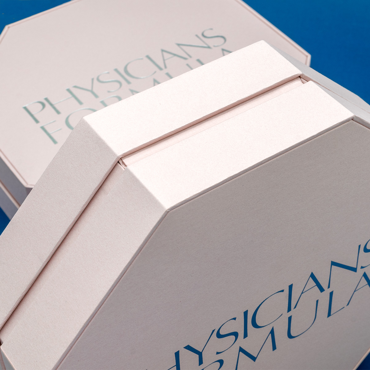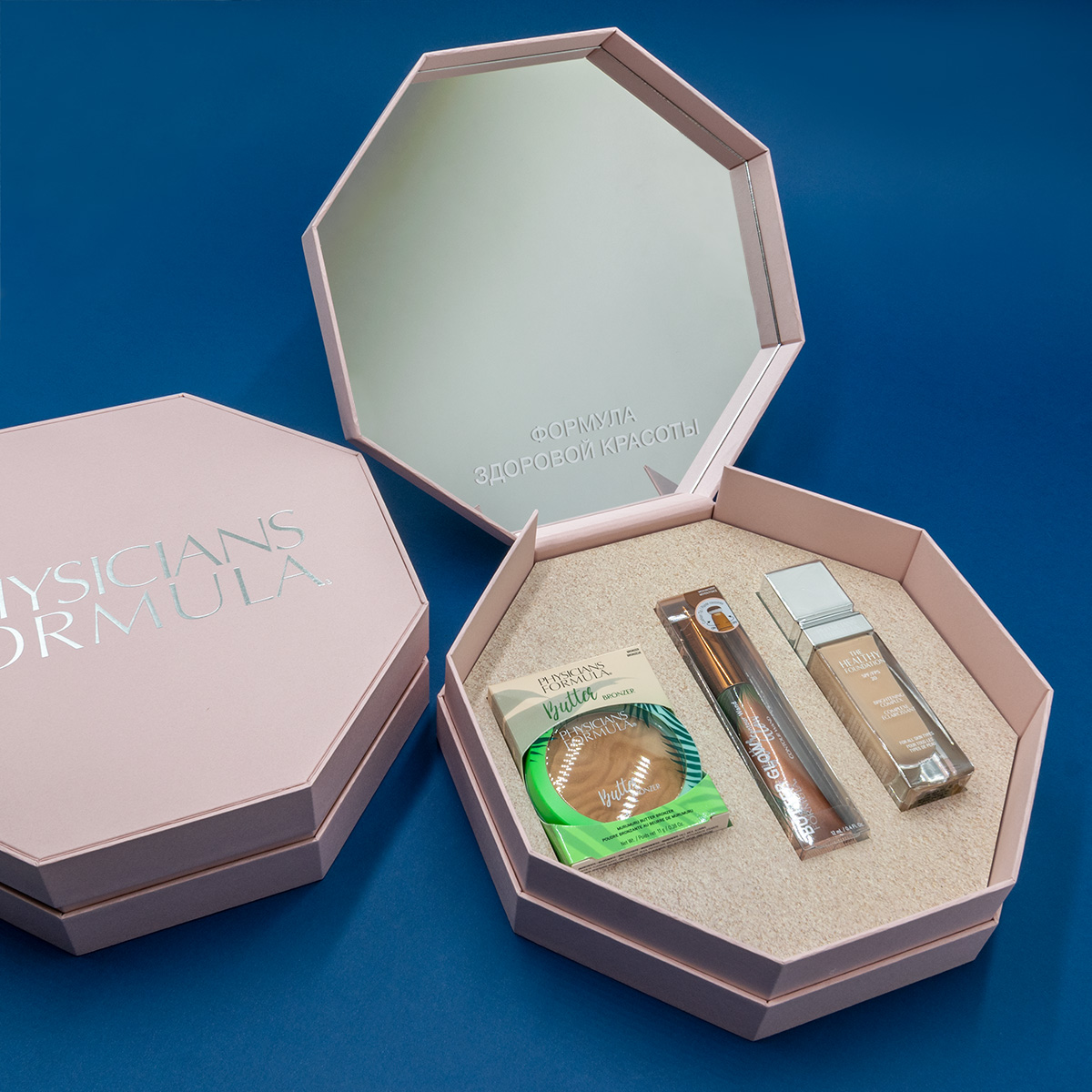 Тип коробки – фигурная крышка-дно на вставке, на внутренней стороне крышке приклеено зеркало. На зеркале – УФ-печать белым. Лайнеры коробки розовые (Колорлаб розовый 110). На крышке выполнено тиснение глянцевым серебром. Ложемент из белой эвапоры. На ложементе – лайнер с печатью песка.